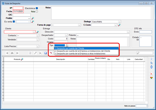 En la guía donde aparece el mensaje, edite y en el campo “Tipo” del bloque “Entrega” indique uno de los tres predefinidos por el Servicio de Impuestos Internos, guarde y envíe nuevamente.