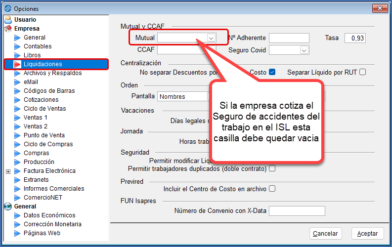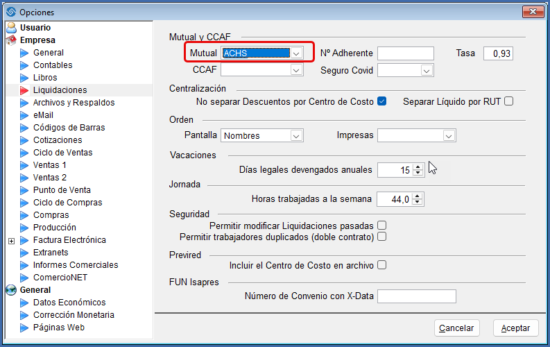 - Ingrese en “Herramientas/Opciones/Liquidaciones”