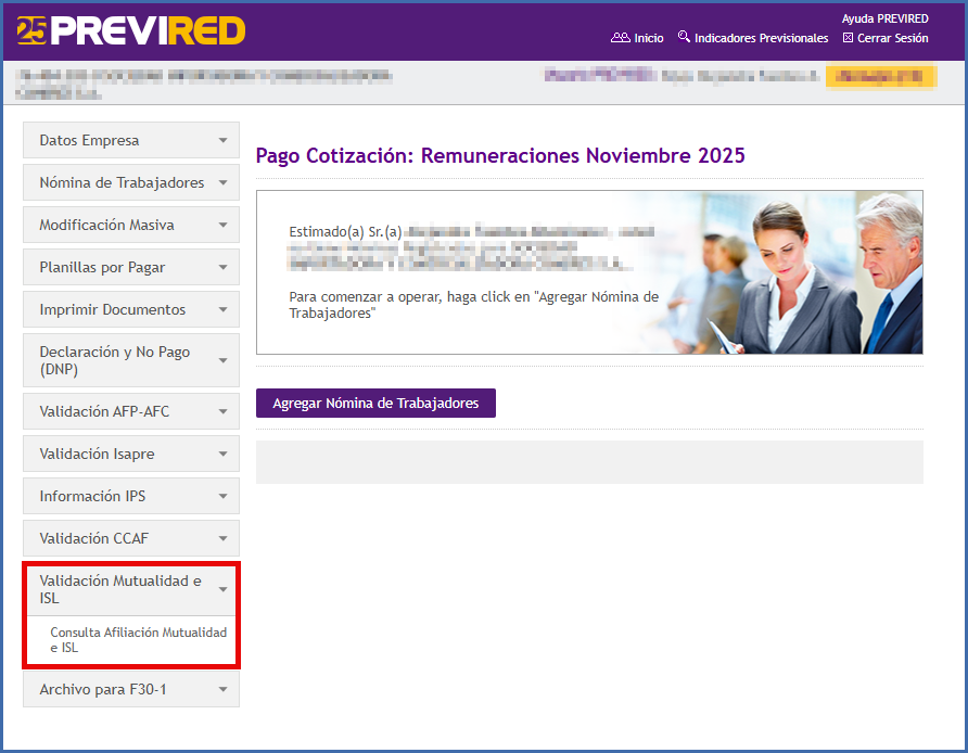 Seleccione “Validación Mutualidad e ISL” para confirmar la institución (Mutual privada o ISL).