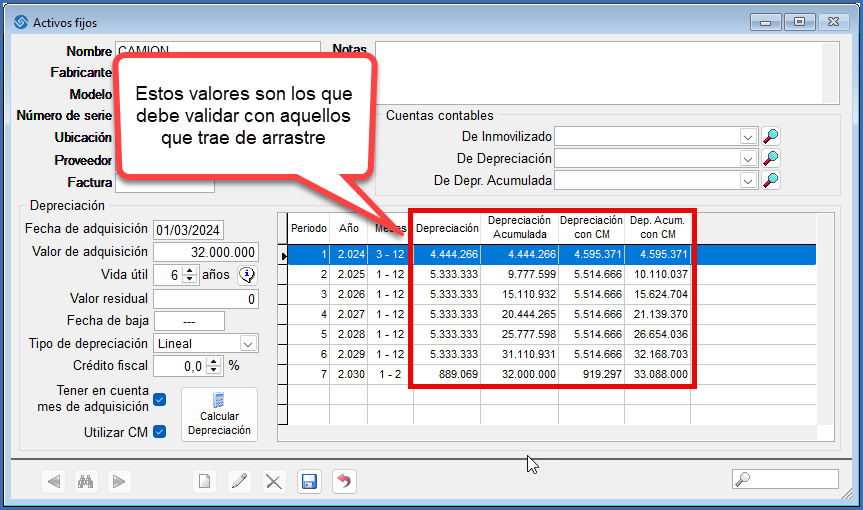 Valide Depreciación: Es importante que valide los datos de depreciación calculados automáticamente en Laudus, coinciden con los datos de arrastre en su software o control anterior.