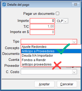 - Modifique el campo “Tipo” por aquel predefinido como “Anticipo a Proveedores” y presione en “Aceptar”