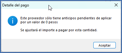 En ocasiones al intentar cancelar una factura con un Anticipo a Proveedores aparece el mensaje “Este proveedor sólo tiene anticipos pendientes de aplicar por un valor de 0 pesos”