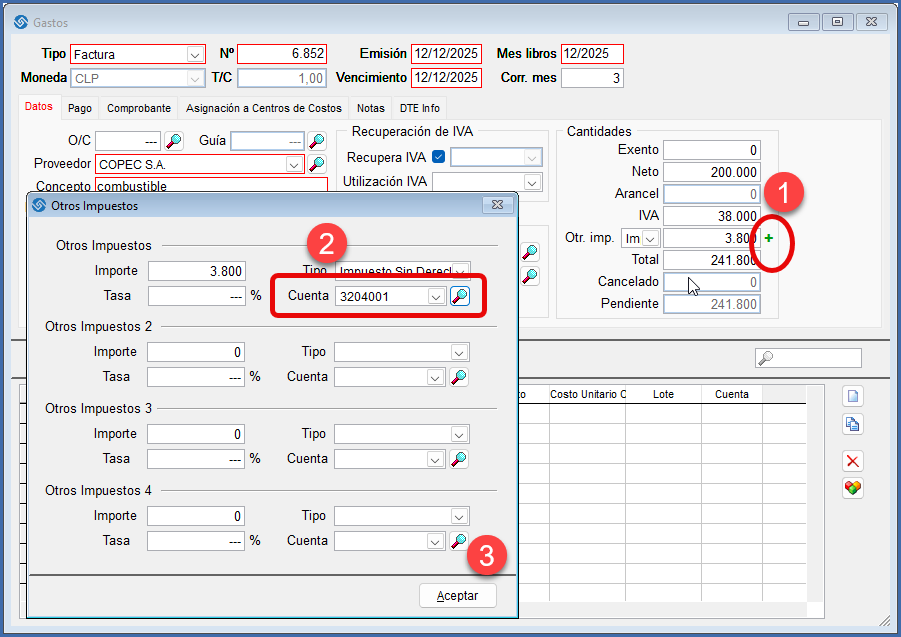 - En Facturas con otros impuestos adicionales (como el combustible) debe estar asociada la cuenta cada impuesto adicional que contiene el documento.