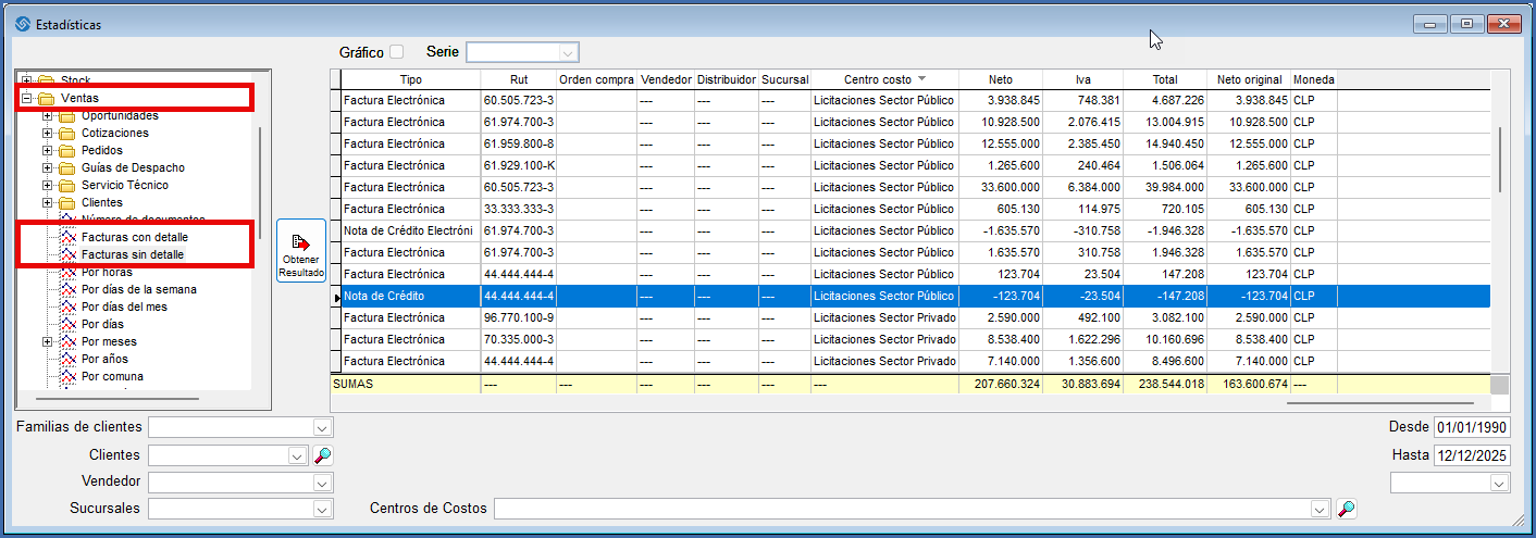 Lo anterior se puede validar en “Herramientas/Estadísticas/Ventas” consultando las “Facturas con o sin detalle”, filtrando por fechas, y ordenando por precio unitario, o bien exportando a Excel para comprobar el IVA de cada documento y detectar donde se puede producir alguna diferencia.