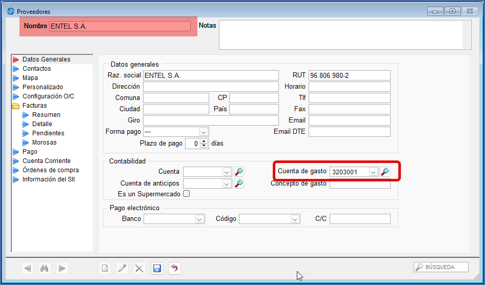 Para agilizar el proceso de contabilización en las compras es aconsejable que en “Compras / Proveedores” asigne la “Cuenta de gasto” que utilizará con frecuencia cada vez que realice compras a un proveedor en particular, esta cuenta puede ser un activo, o gasto (o bien pasivo si fuera el caso). El contador tiene una labor importante en su definición.