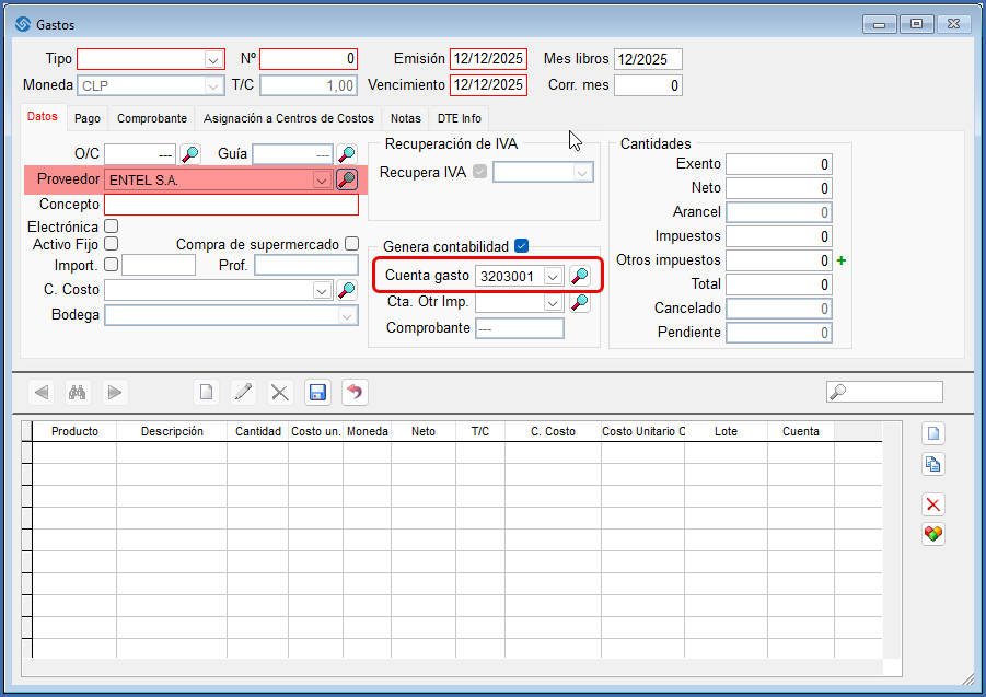 Al ingresar en “Compras/Facturas, boletas” e ingrese el respectivo proveedor asumirá la cuenta de gasto que trae desde la ficha, la que puede modificar para ese documento.