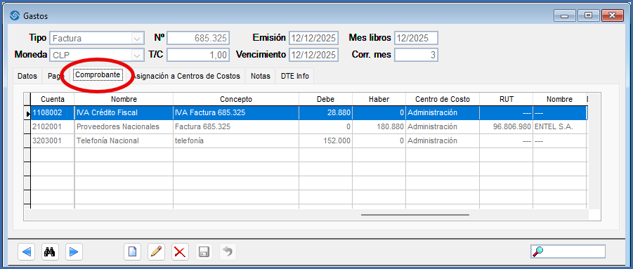 Al grabar se genera el número de comprobante el que es posible revisar en la pestaña “Comprobante”.