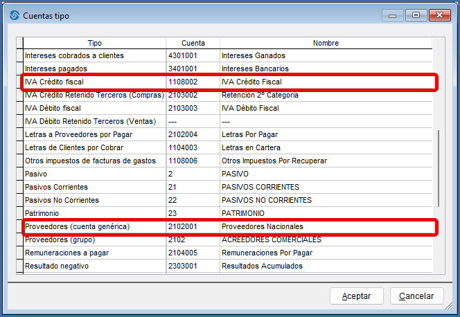 Las cuentas del proveedor e IVA Crédito fiscal vienen por defecto asociadas en “Contabilidad/Cuentas Tipo” por tratarse de cuentas genéricas.