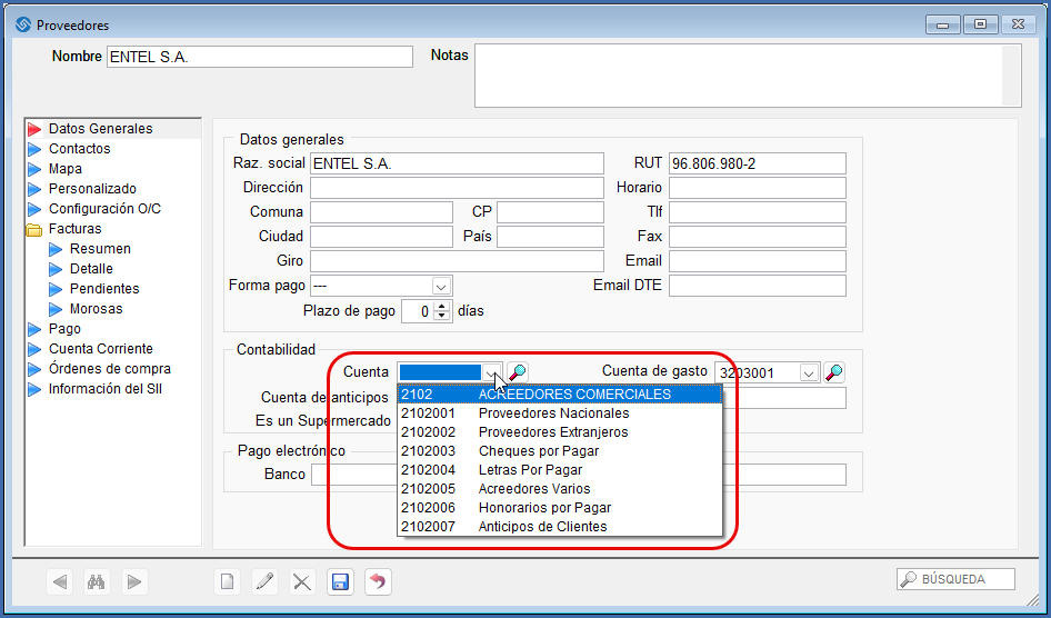 Si para un “Proveedor” en particular desea indicar una cuenta diferente a la establecida en “Cuentas Tipo” ingrese en la ficha del Proveedor, edite y en la casilla “Cuenta” asigne aquella donde desea contabilizar sus compras. La cuenta que aquí utilice debe ser una de las que propone al pulsar sobre el desplegable.