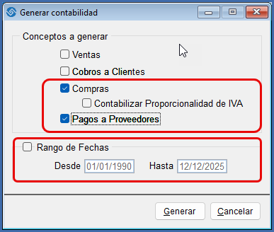 Ingrese en “Contabilidad/Utilidades/Generar Contabilidad” y habilite “Compras” y “Pagos” establezca también un rango de fechas, y presione en “Generar”