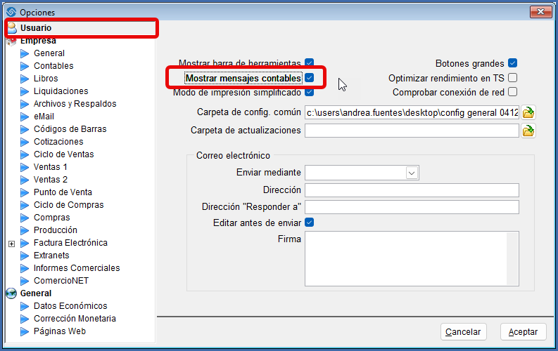 Otra validación útil puede habilitar en “Herramientas/Opciones/Usuario” la función “Mostrar mensajes contables” arrojará una alerta cada vez que se intente guardar un documento sin generar contabilidad.