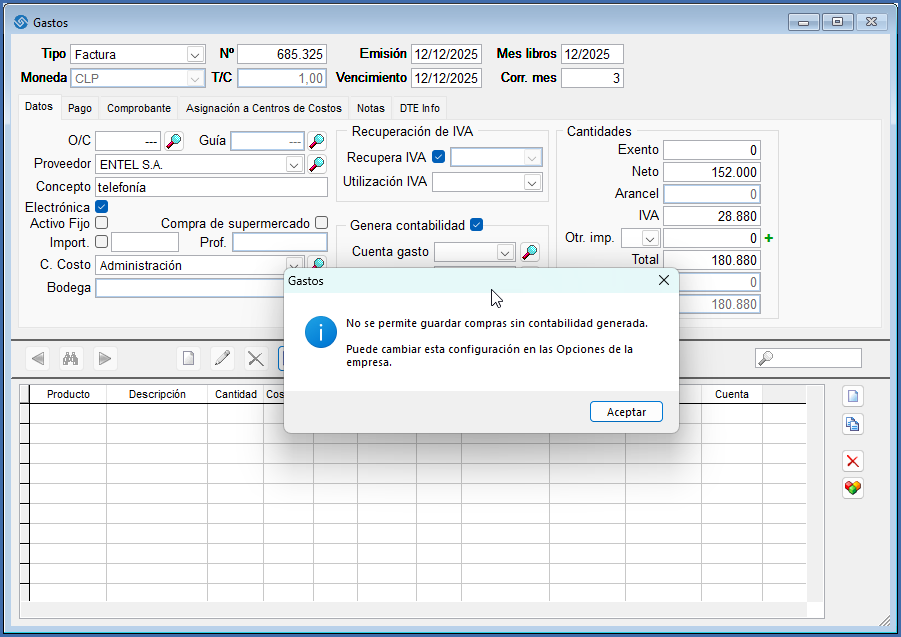 De esta forma no podrá guardar una factura de compra sin haber generado la contabilidad.