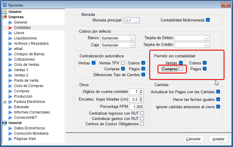 Para evitar guardar documentos sin contabilidad, es aconsejable ingresar en "Herramientas/Opciones/Contables" y en el bloque "Permitir sin Contabilidad" desactivar al menos la función para las compras